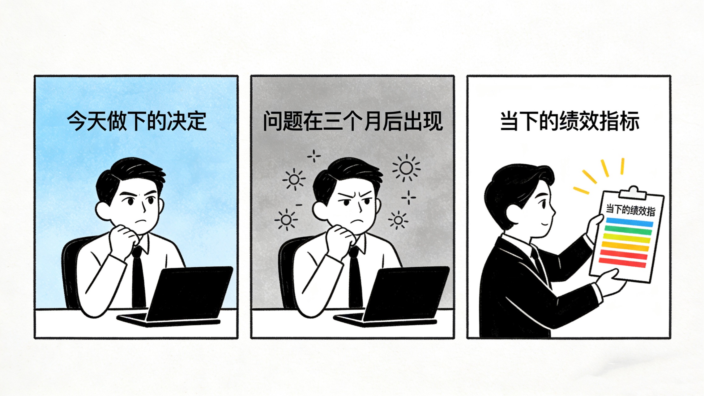 当期指标→立刻被看见;当期结果→立刻被奖惩;长期后果→不可见/不可归因/不在考核中。