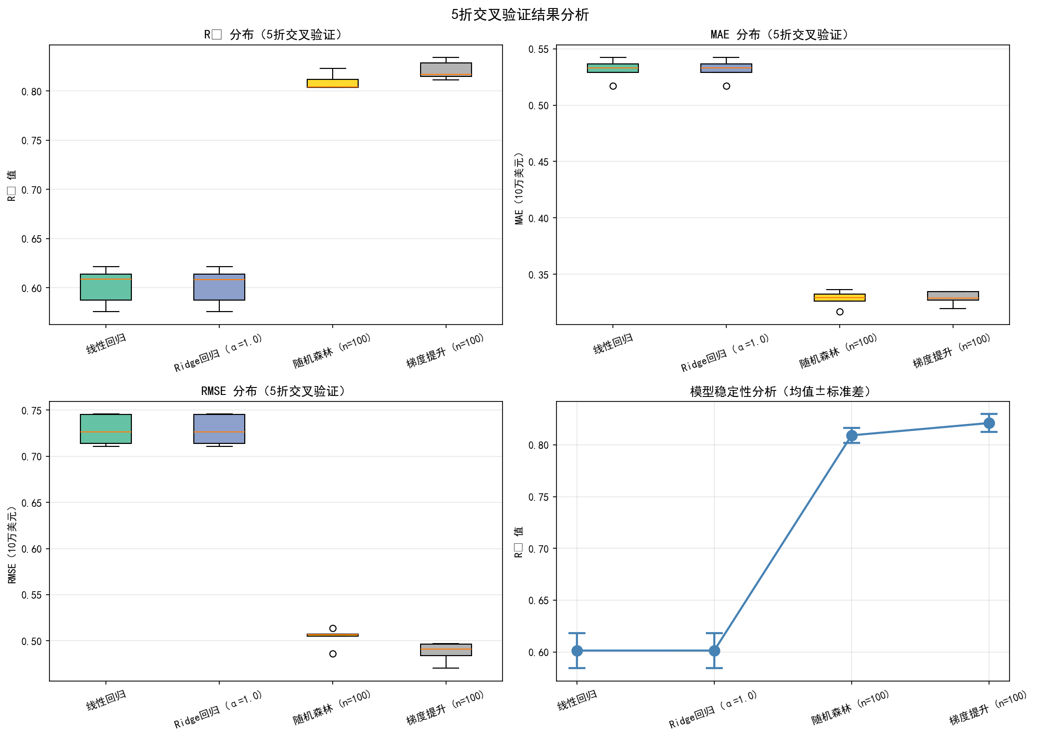 1. 梯度提升 (n=100) | R² Mean: 0.8211±0.0086 | RMSE Mean: $48775.73±$985.48