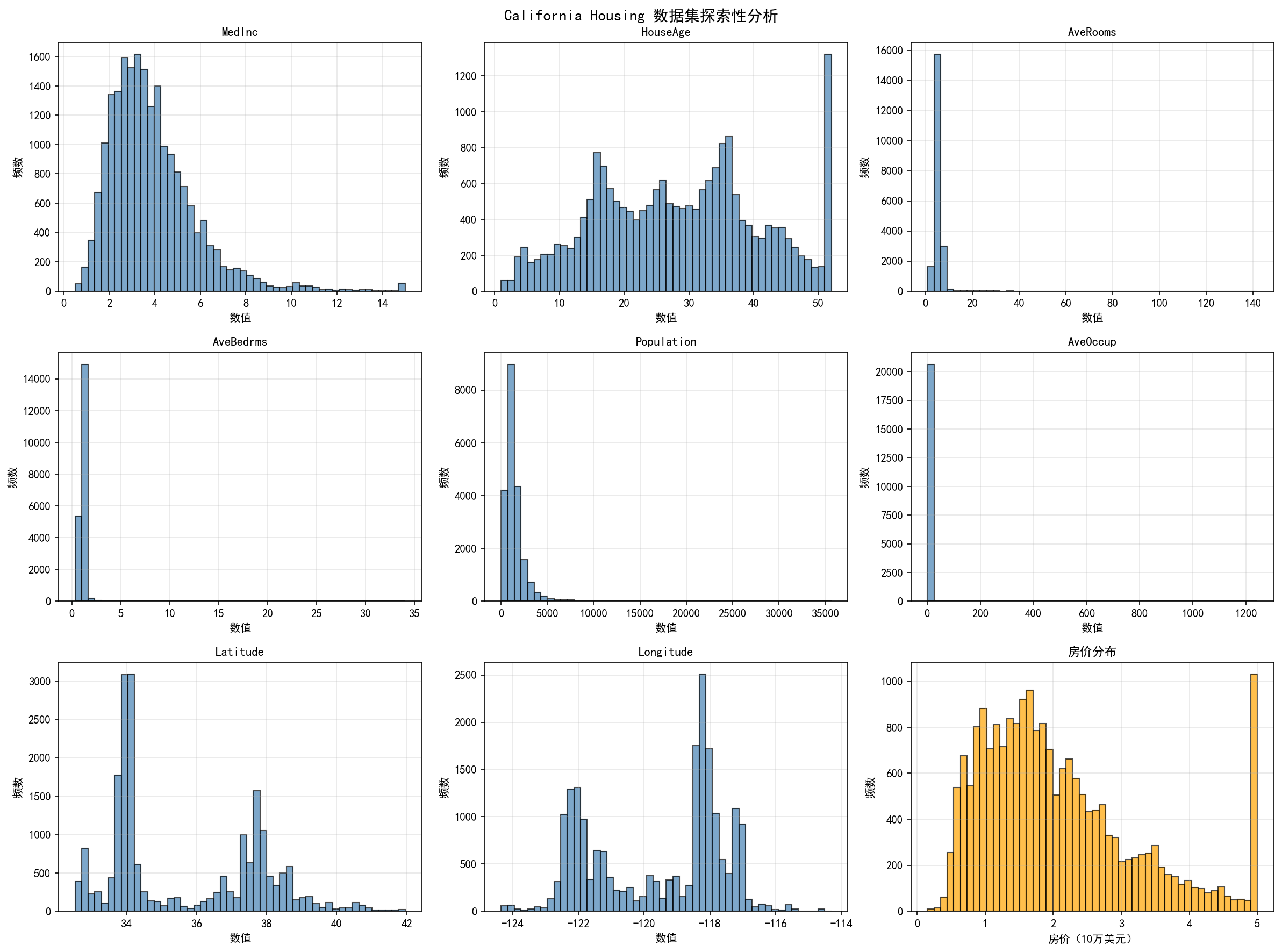 现在我们将使用一个真实的房价数据集来演示如何在实际项目中应用各种回归评估指标。我们使用California Housing数据集,这是一个包含约20000个样本、8个特征的房价预测数据集。这个数据集来自1990年的美国人口普查,包含了加州各地区的房价信息及相关特征。数据集中的特征包括:MedInc(中位数收入)、HouseAge(房屋年龄)、AveRooms(平均房间数)、AveBedrms(平均卧室数)、Population(人口)、AveOccup(平均占用人数)、Latitude(纬度)和Longitude(经度)。目标变量是MedHouseValue(中位房价),单位是10万美元。这个数据集的特点是特征维度适中、样本量充足、数据相对干净,非常适合用来演示回归模型的评估方法。
