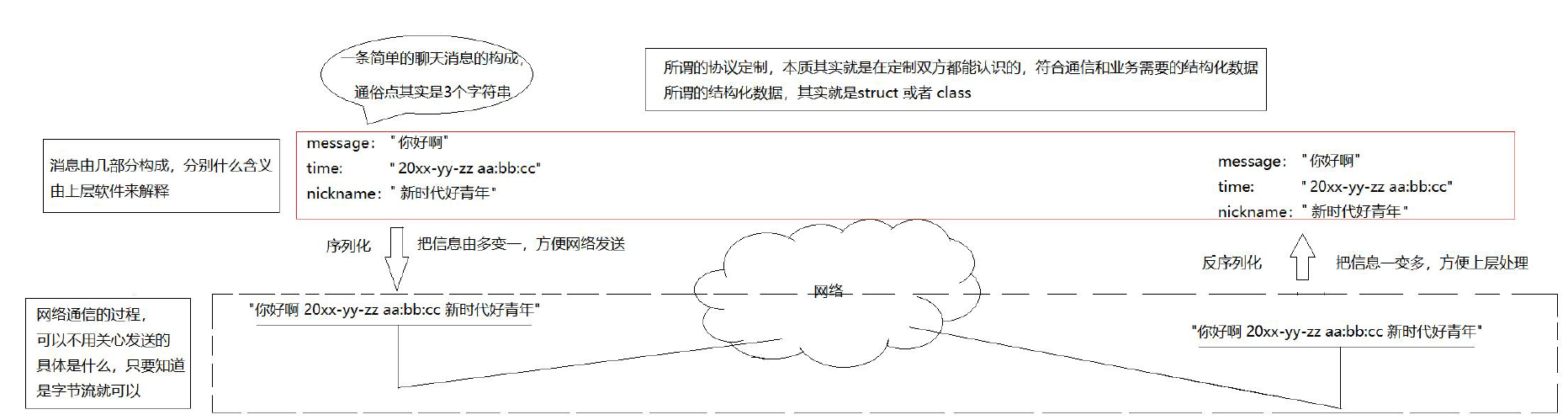 • 发送数据时将这个结构体按照一个规则转换成字符串, 接收到数据的时候再按照相同的规则把字符串转化回结构体;