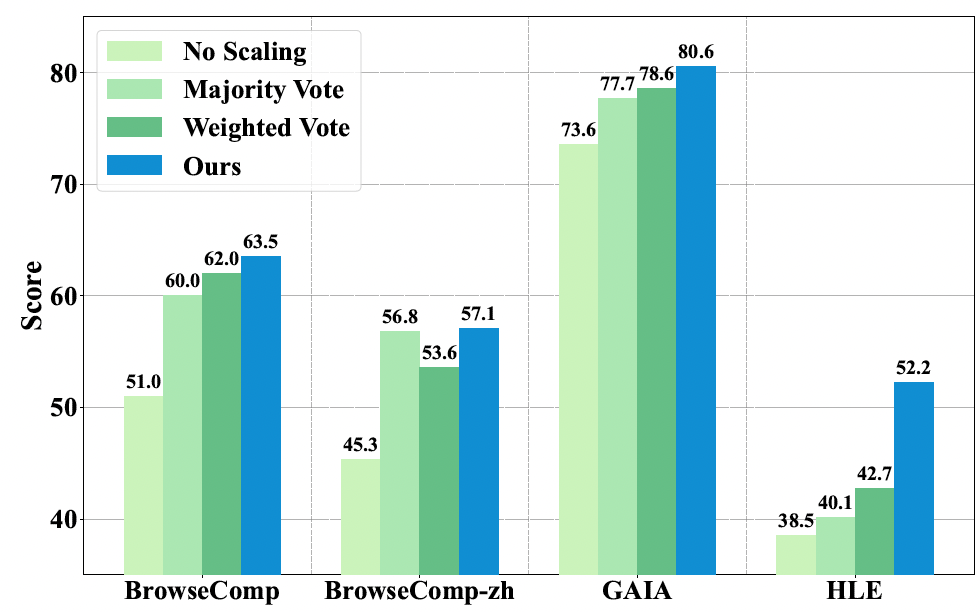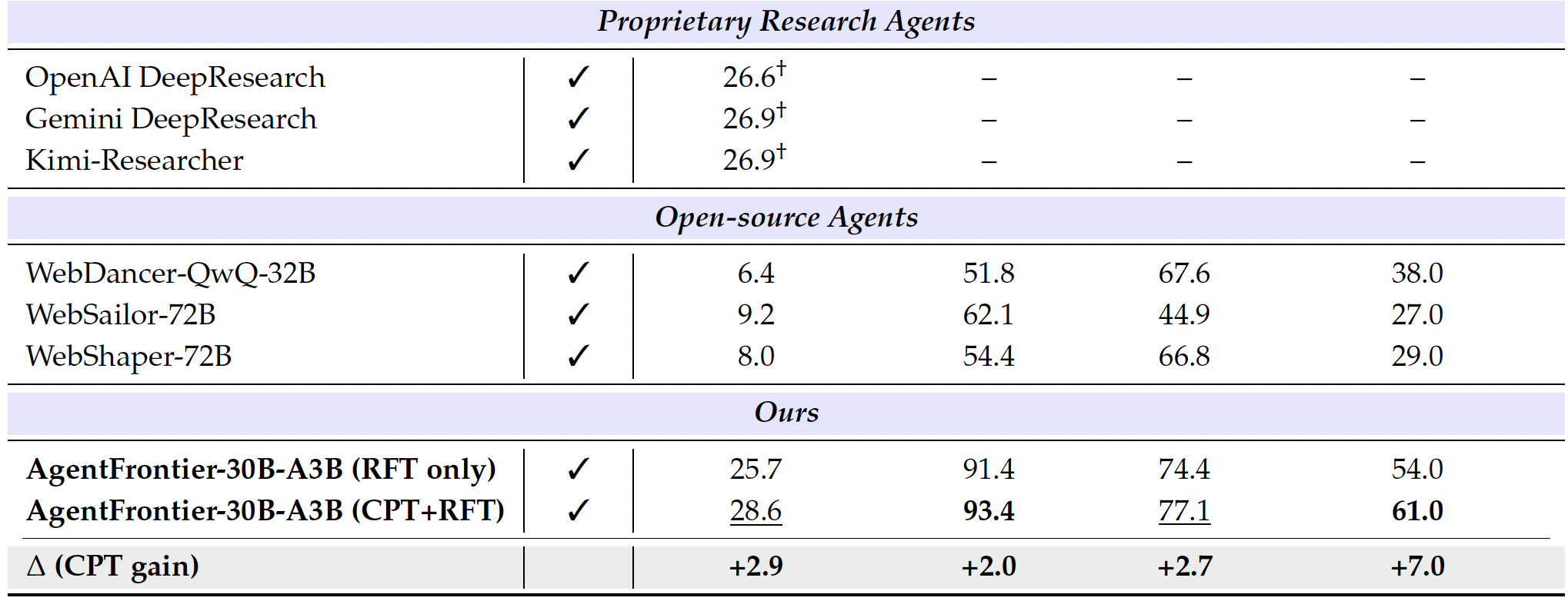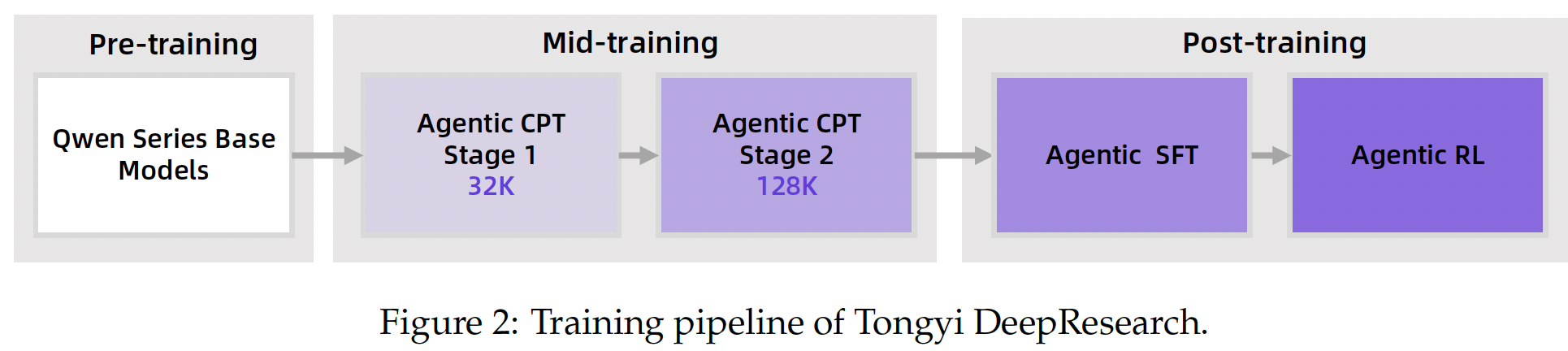 - Post-training阶段:使用包括Websailor、Websailor-v2、Webshaper和WebFrontier的方法,合成Agent的QA数据和轨迹数据,最后在RL阶段使用GRPO