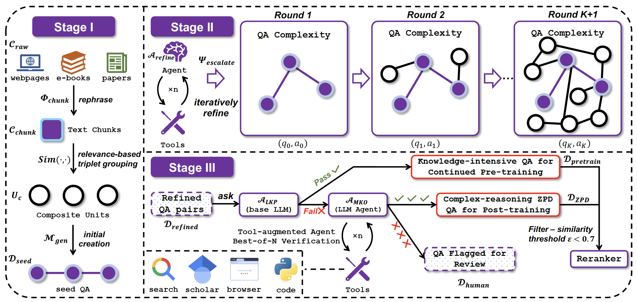 - 通过合成更合适的难的问题(LLM没法独自解决,可以被LLM+tool解决),提升Agent的复杂问题推理能力。整体方法和WebResearcher几乎一致,只是WebResearcher里面被base LLM回答对的问题直接丢弃了,这里放到pretrain数据集里面。