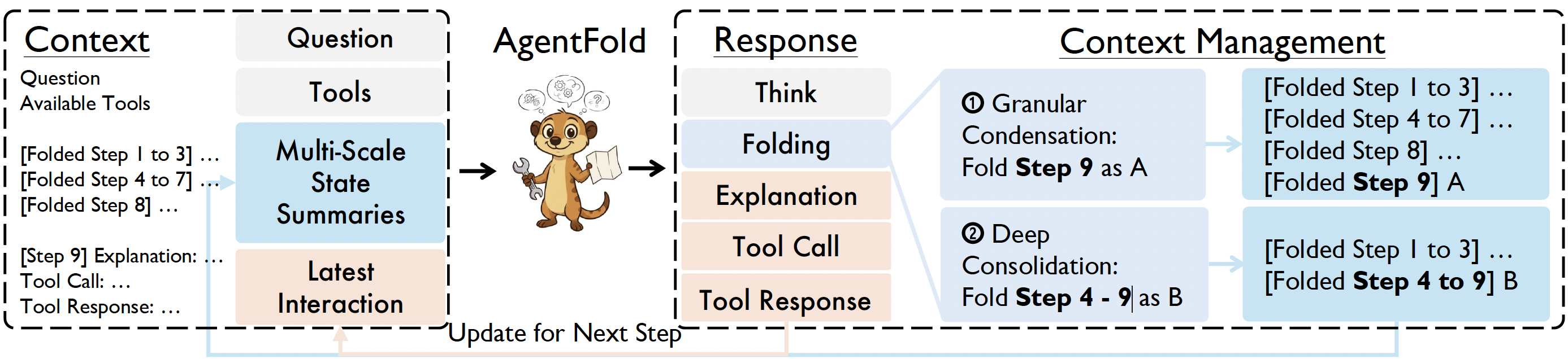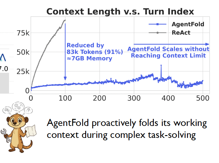 - 这篇论文提出了一种上下文管理的方法AgentFold,能让Agent运行更多step执行复杂任务。ReAct的上下文增长是线性的,AgentFold通过压缩来减少上下文长度。