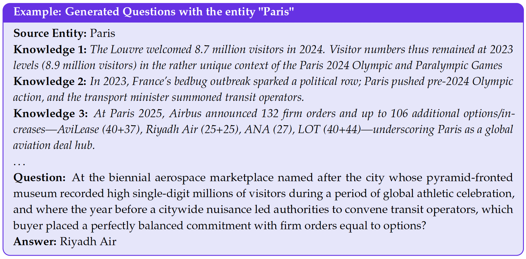 - Union-based Search Construction:让anchor只是链接到最后答案的桥梁而不是答案本身。先从anchor实体的子树中选取一个特定的第三层实体(例如,国籍"英国")作为枢纽(pivot)。随后,设计问题的后半部分,迫使agent必须利用这一枢纽属性,发起新一轮搜索。最终的"目标实体"被定义为所有满足以下两个条件的第二层实体:(1)与锚点共享该枢纽属性(即同样是英国人);(2)满足原始的交集条件(即同时获得诺贝尔奖和布克奖)