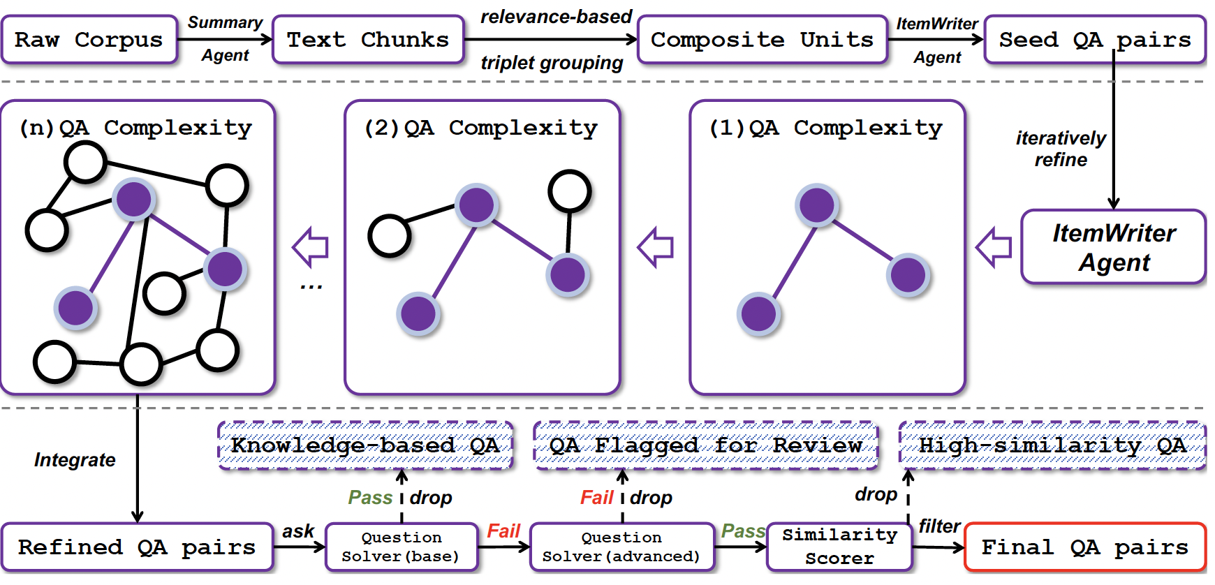 QA数据合成过程为: - 使用LLM把语料信息压缩为一个个chunk,对于一个chunk,寻找和它向量相似度高的chunk组成语义单元,使用LLM生成问题,得到原始QA对。