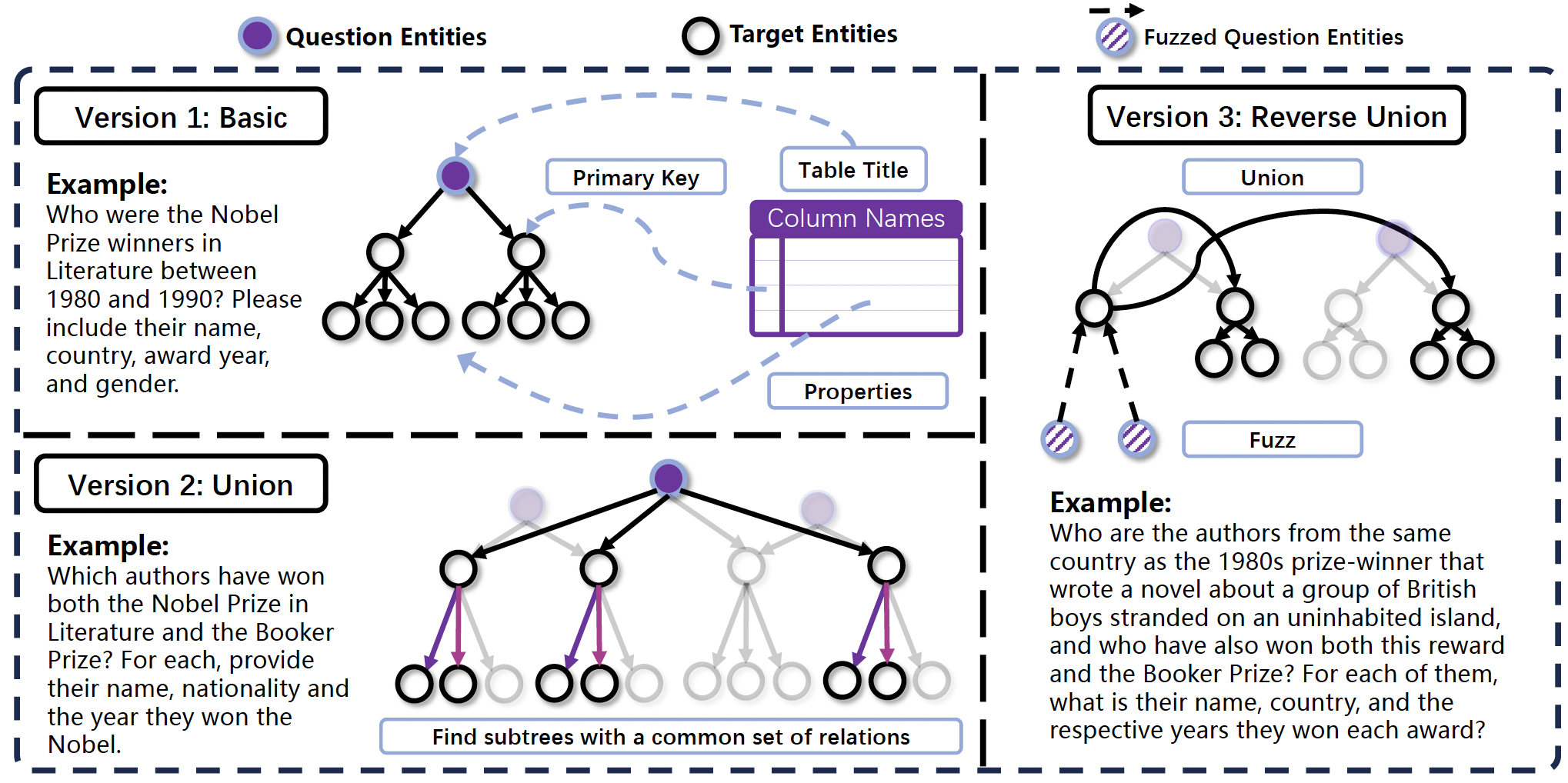 尽管奖项不同,但它们的第二层实体都是"作者",这些共享的关系(如 has_name, has_nationality)可以确认"这两棵树讲的是同类事物",从而可以把它们联合起来提问,例如LLM合成的问题Q为"哪些作者同时获得过诺贝尔文学奖和布克奖"。要回答这个问题,需要先将两个奖项的获奖者分别识别为中间的"目标实体",然后求这两个集合的交集,才能得到最终的"目标实体",回答问题的难度相比于version1上升了。
