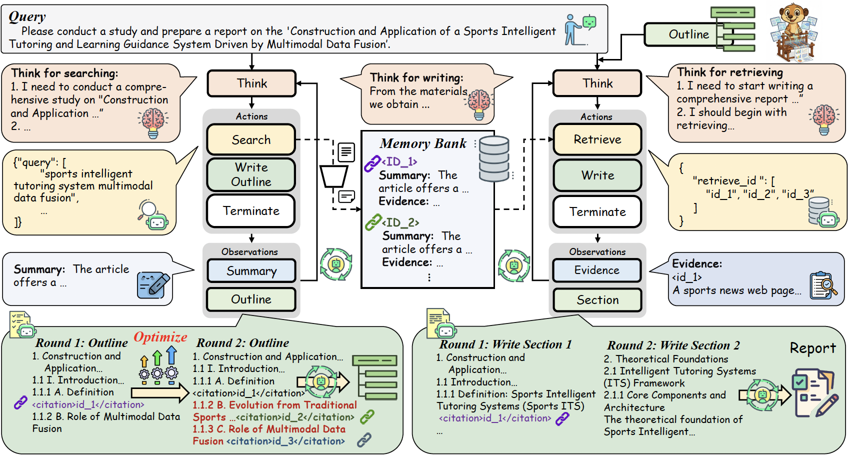 - 相比于ReAct把所有的thought-observation存入上下文,IterResearch使用report的方式管理上下文,每次think阶段,把历史report、当前思考和准备执行的plan和最近一次的action-observation作为上下文,整理成一个summary report中,然后再去执行action,避免超长上下文,缓解错误累积传播的问题