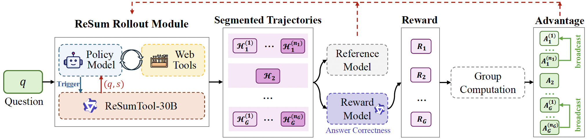 训练一个ReSum模型来完成总结任务,对于何时进行summary,可以是固定token预算/固定step间隔,或者是训练一个policy model来决定何时触发上下文的summary