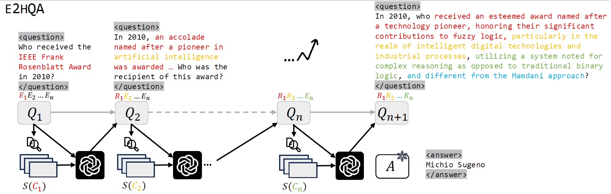 以图中为例, Q 1 Q_1 Q1为谁获得了Frank Rosenblatt Award,把这个实体替换成为了"an accolade named after a pioneer in artificial intelligence was awarded"。第二轮迭代对着"artificial intelligence"这个实体展开。最终原始简单直白的问题变成了一个比较绕的复杂的问题。