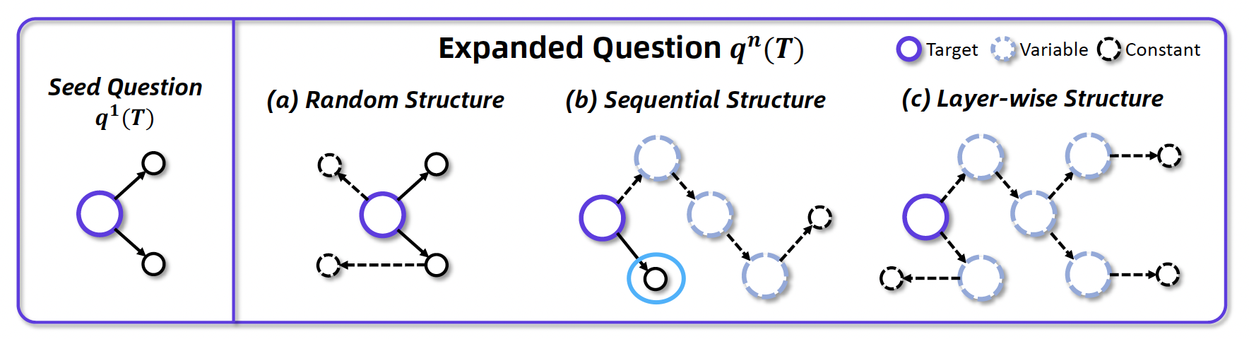 - 之前的几篇数据合成方法,存在2个问题:(1)信息冗余-例如下图a中,迭代3次把问题复杂化了之后,可能复杂化的这3个实体,和原始问题答案的实体是直接相连的,模型只需要找到其中1个的答案,就能够回答原始问题,这3个复杂化是冗余的;(2)存在捷径-例如下图b中,假如也是把实体复杂化了很多次,但是里面存在一个和原始问题答案直接相连的实体,如果模型搜到了这个实体的信息,可以直接找到答案,不需要从预设的最远的那个实体开始搜索