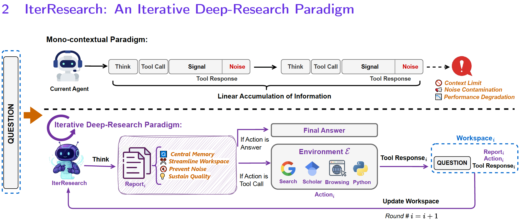- 当下deep-research的智能体面临2个问题:(1)上下文超长:模型的上下文窗口是固定长度,ReAct中每一步结果都进入上下文,step增加,留给当前主动推理的空间会越来越少;(2)噪声污染不可逆:当前方法,上下文只增不减,一旦中间出现了错误噪声,错误会随着step增加而累积放大