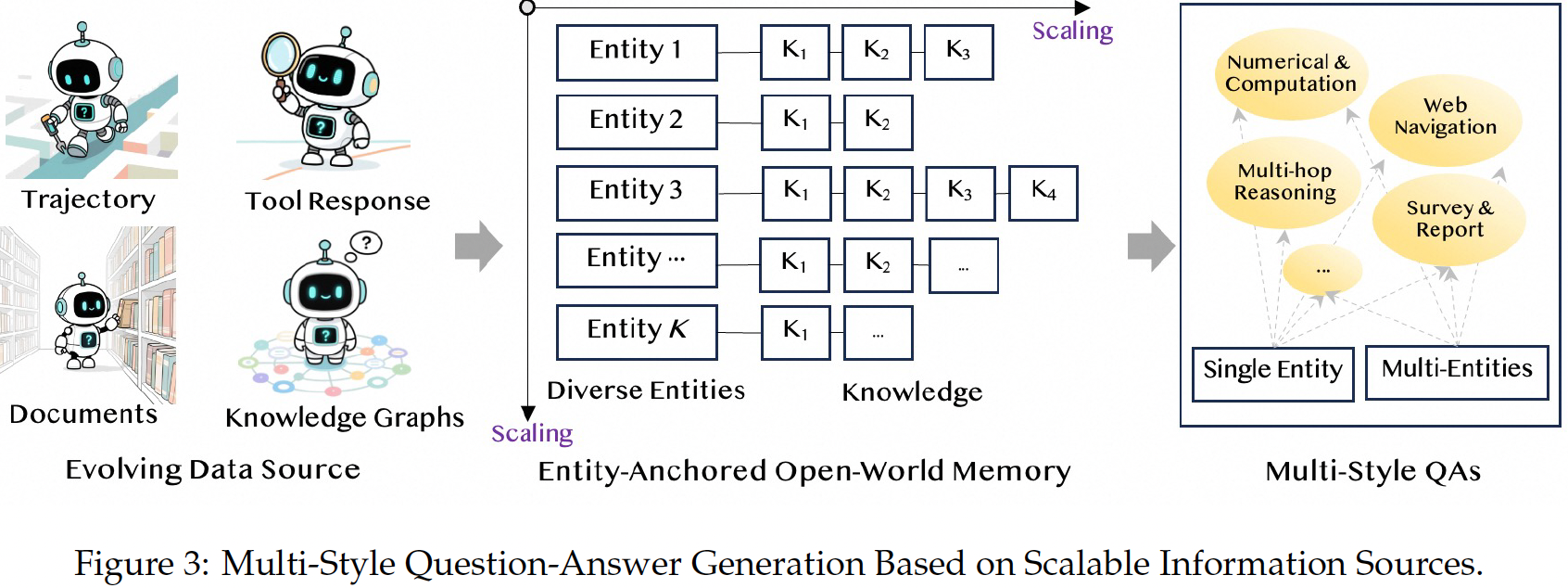 - 这篇论文的目标是要提升模型面对不确定性复杂问题、大量信息的搜索浏览能力。之前的QA合成方法造的QA对太简单,模型不足以学习到更强大的能力,该文中提出了更复杂问题的QA对和轨迹合成方法。
