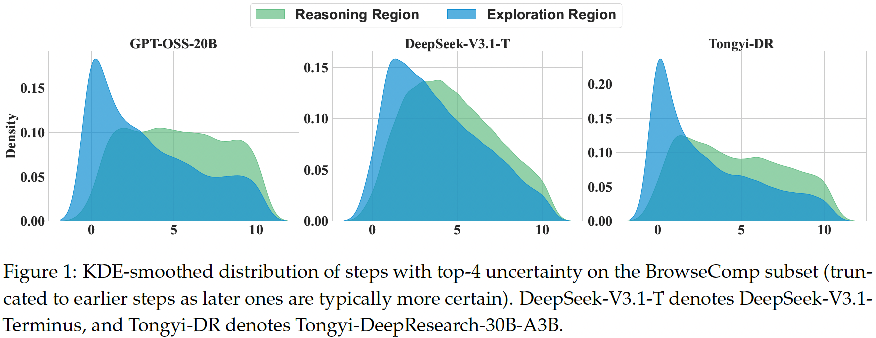 把Agent的输出token分成reasoning tokens和exploration tokens,在数据集上测试发现这两种token的perplexity的分布不一样(perplexity越高,置信度越低)。上面的图是任务执行过程中观测到的不确定性最高的前 4 个step的分布情况,横轴是step。exploration的不确定性在最早阶段达到最高水平,此时智能体还未获取到更多外部信息;而reasoning不确定性则稍晚达到峰值,此时智能体开始将检索到的信息整合进其内部推理过程。随着任务的推进,这两种不确定性均逐渐降低。