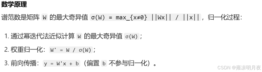 对权重矩阵做谱归一化 :不直接归一化特征,而是对神经网络的权重矩阵 W 进行标准化,限制其「谱范数(Spectral Norm)」≤1,从而控制模型的 Lipschitz 常数,避免 GAN 训练中的模式崩溃。
