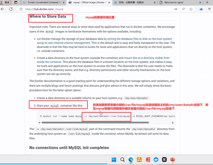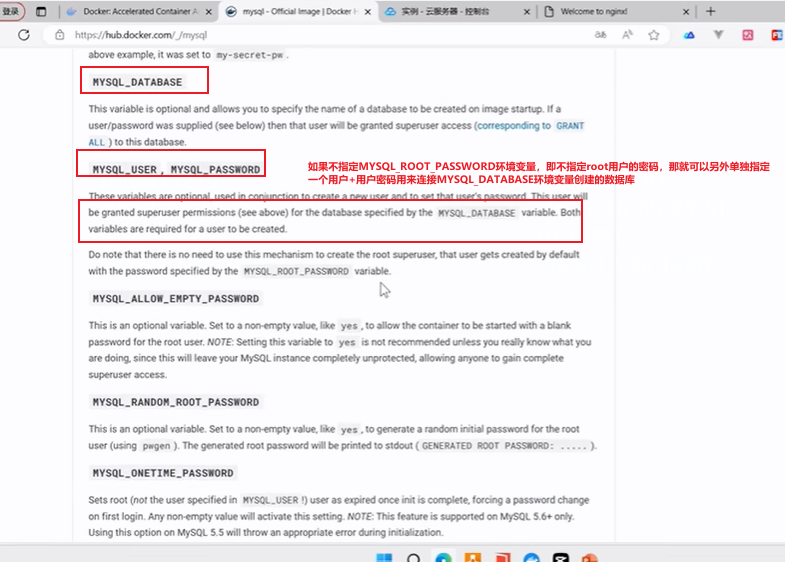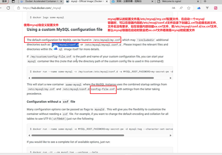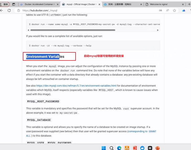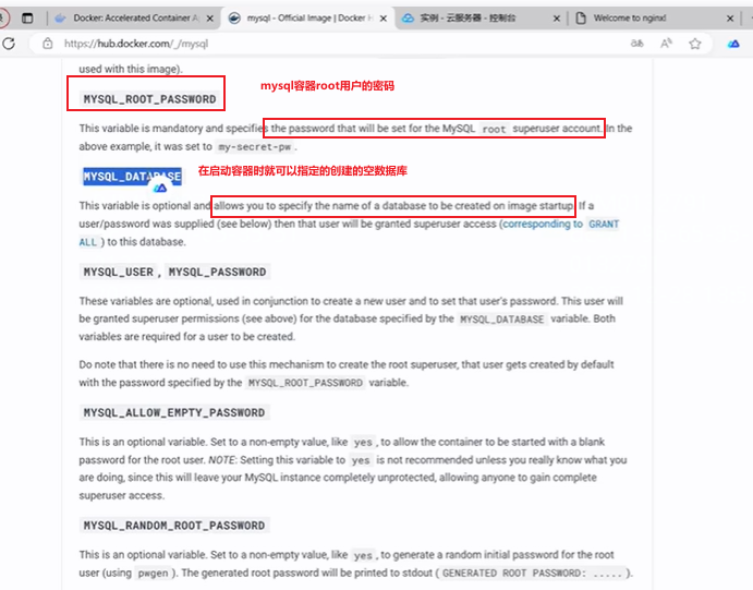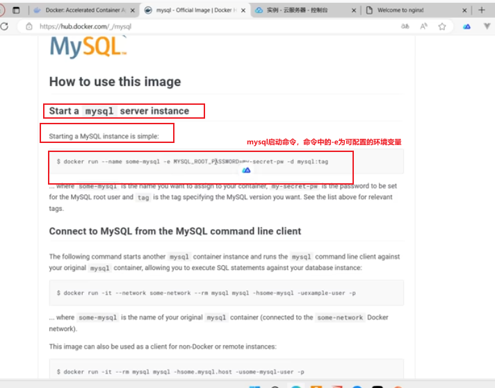 以下内容需要首先去hub.docker.com官网去查看指定镜像在启动容器时的用法: