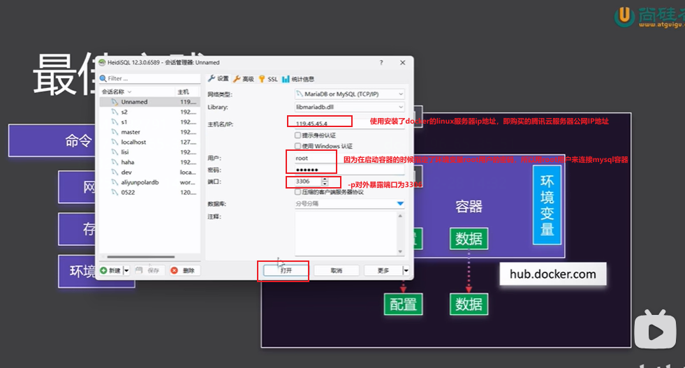 1.连接的IP地址为安装docker的服务器地址,确保该容器的对外暴露的端口已经去掉防火墙啥的,否则外部电脑连接不上,如在某一个linux服务器安装了docker,并在docker中启动了mysql容器应用,且这个mysql容器应用在linux服务器暴露的端口是3306,确保这个linux服务器3306端口已经开放防火墙规则,否则在windows电脑上连接这个linux服务器的3306的mysql服务是连接不成功的。如果IP地址为一些云服务器,确定使用公网IP地址,否则也连接不上。(个人理解。。。。)