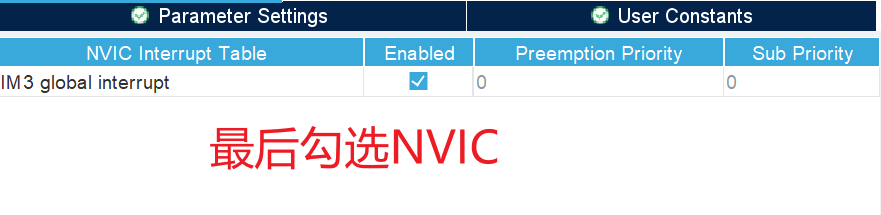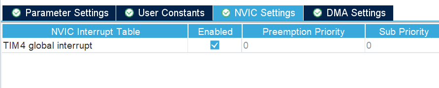 NVIC Settings:优先级:与 TIM3 一致或略低(如Preemption Priority=1)。