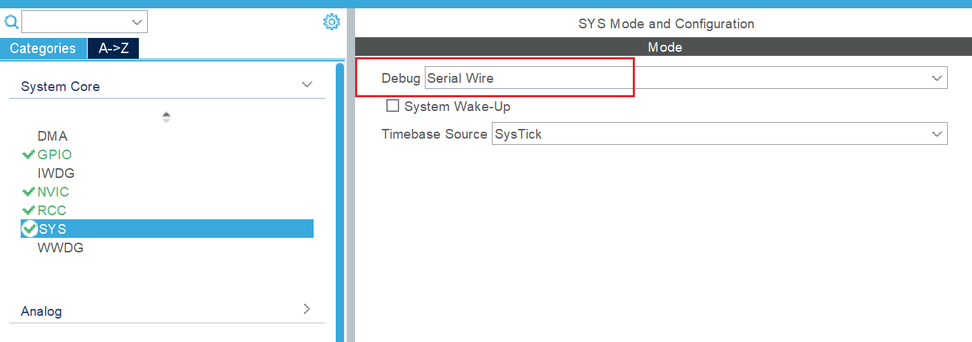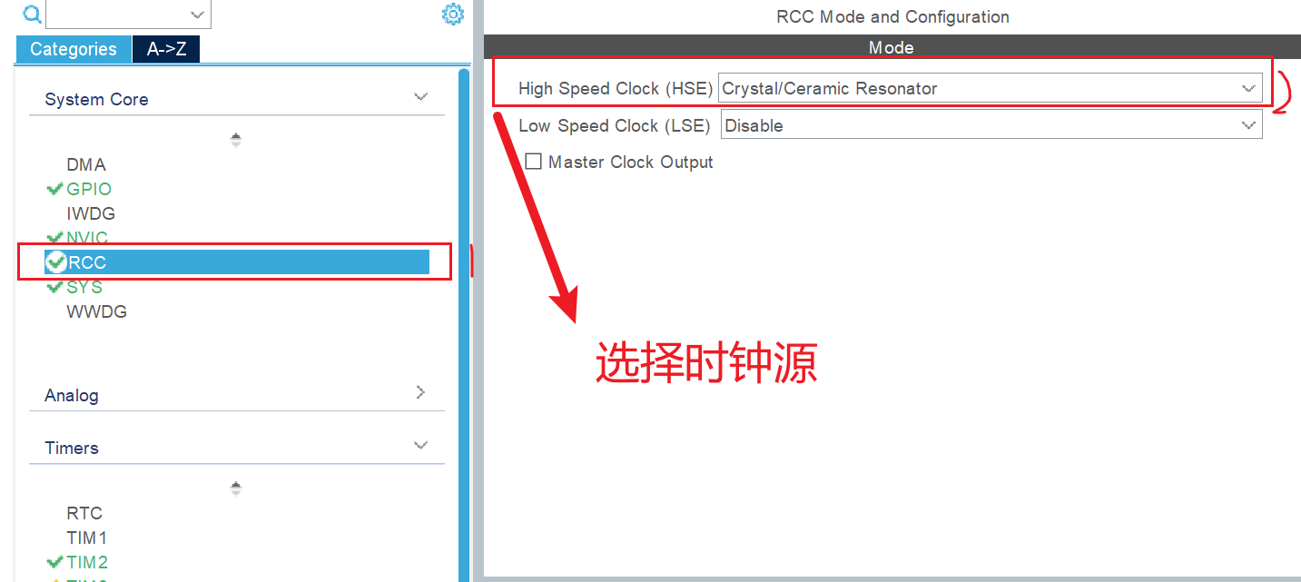 | HSE | Crystal/Ceramic Resonator | 高速外部时钟(High Speed External),选择 "晶振 / 陶瓷谐振器" 作为时钟源 |