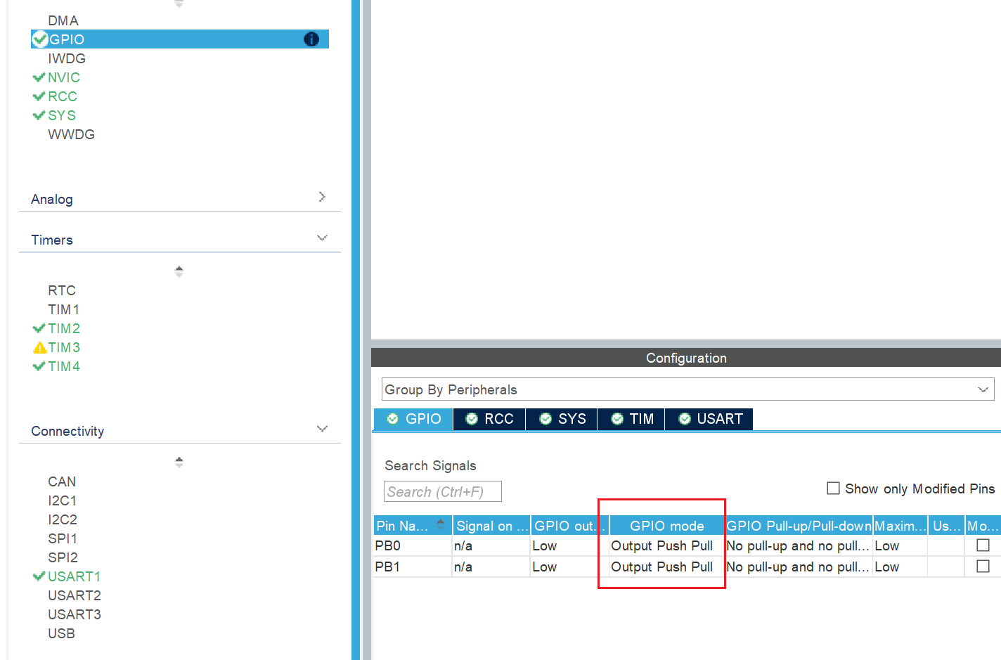 然后将PB0和PB1配置为Output Push Pull(推挽输出)模式;
