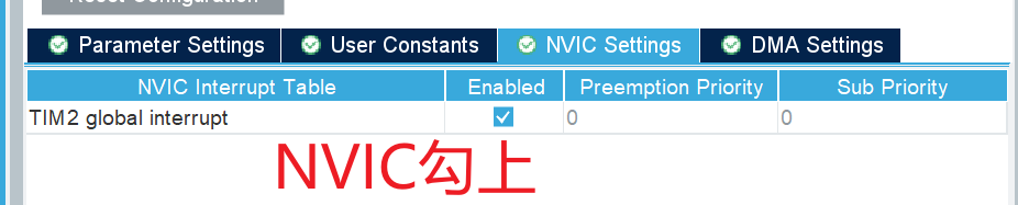勾选TIM2 global interrupt;Counter Mode: Up;
