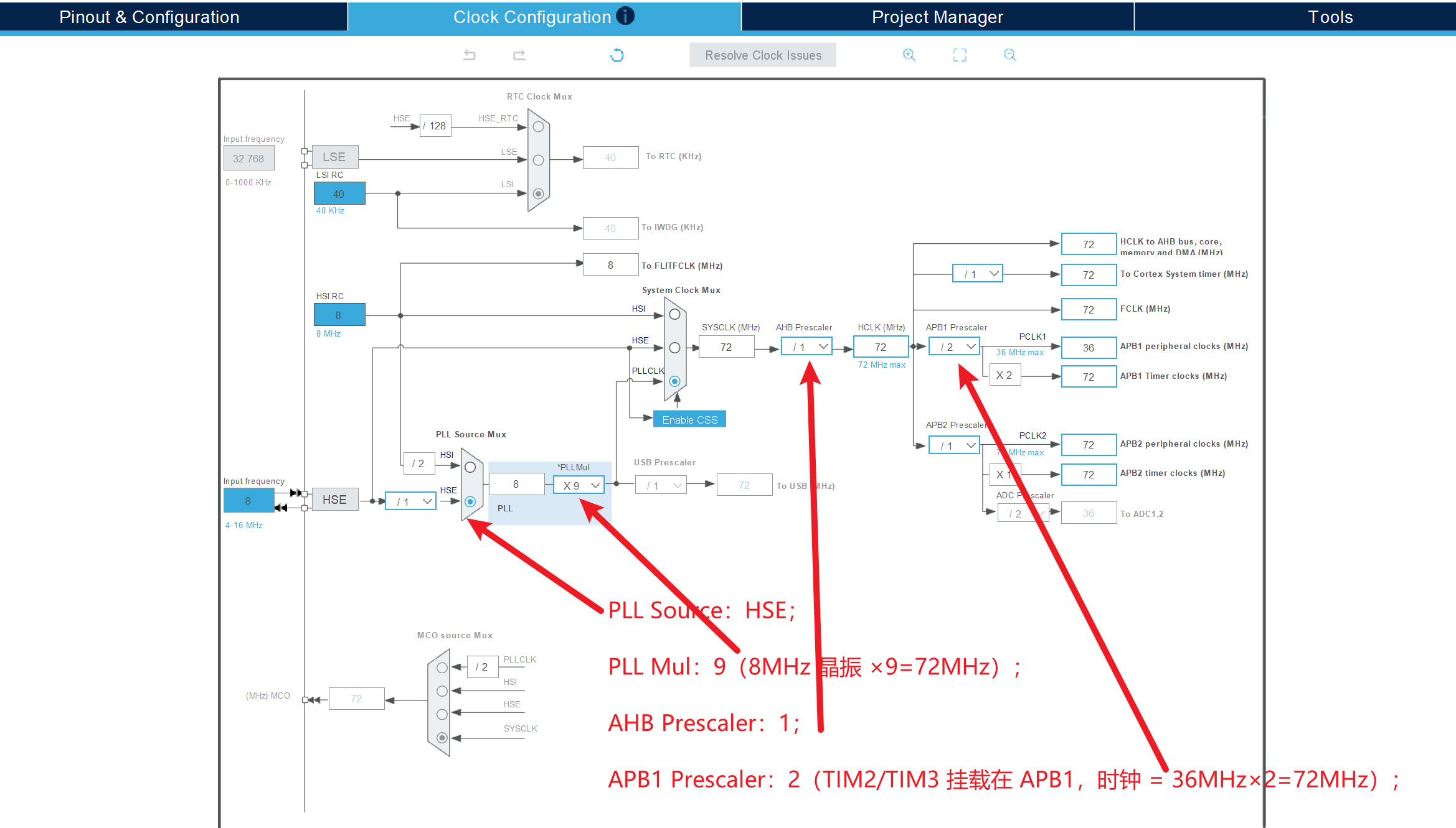 HCLK设为 72MHz(STM32F103 最大主频),配置如下: