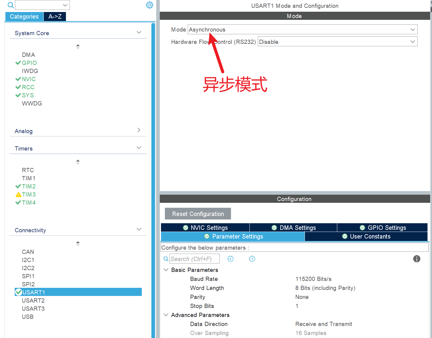 Asynchronous:异步模式,是串口通信最常用的模式(无需时钟同步,仅通过 RX/TX 引脚通信);