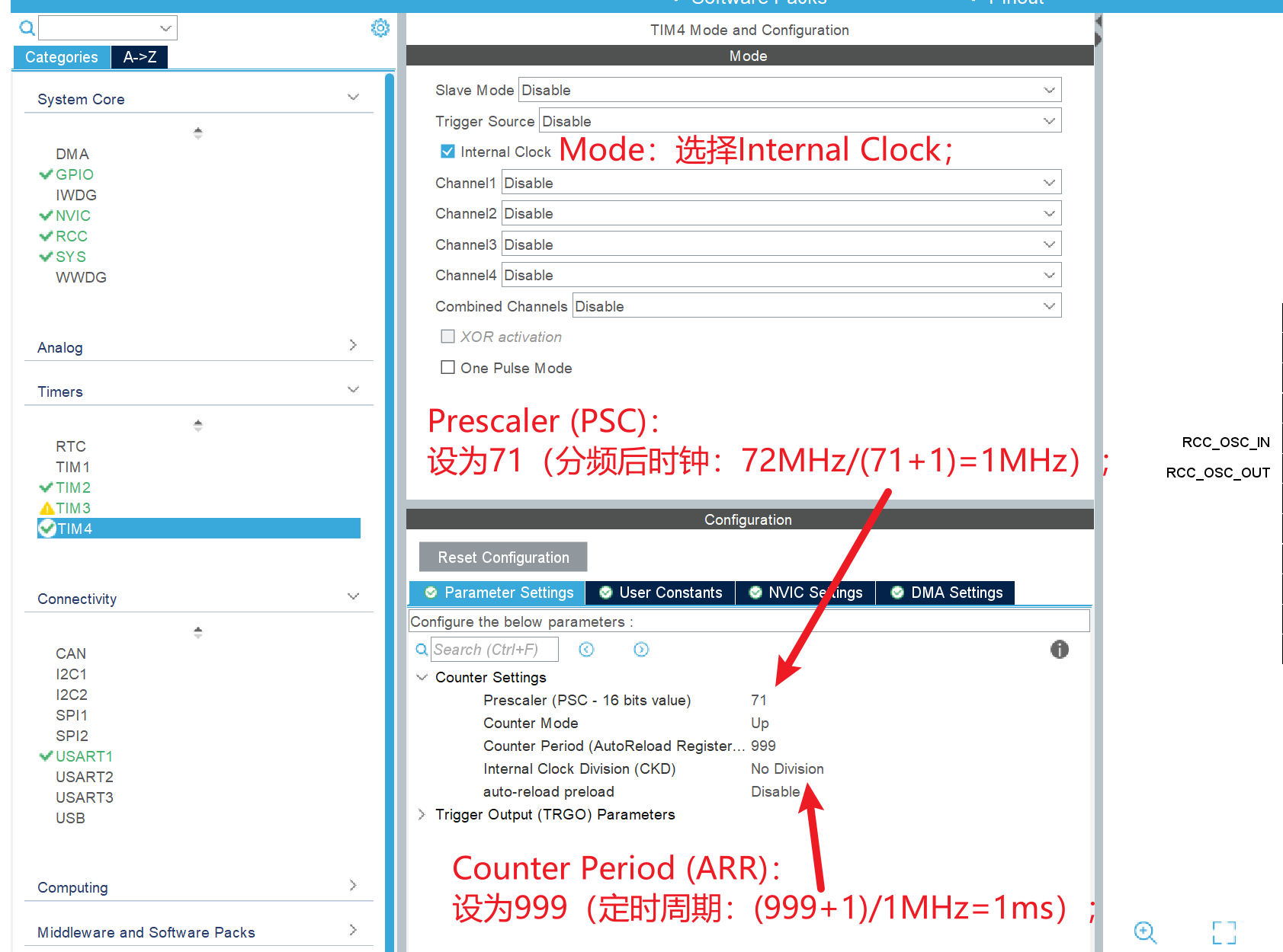 Counter Period (ARR):设为999(定时周期:(999+1)/1MHz=1ms);