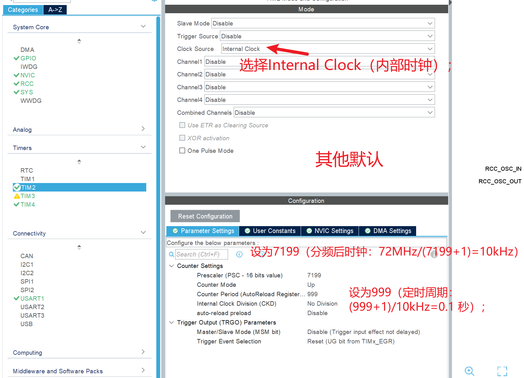 Prescaler (PSC):设为7199(分频后时钟:72MHz/(7199+1)=10kHz);