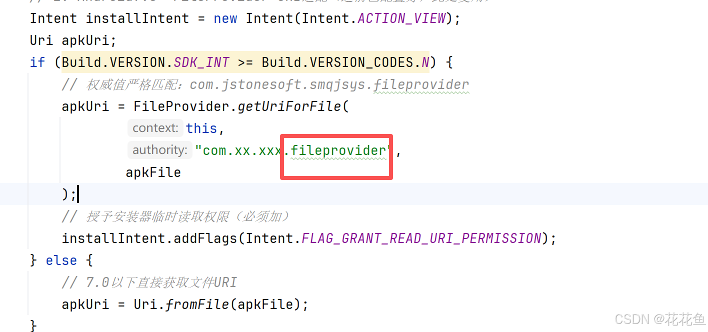 installIntent.addFlags(Intent.FLAG_GRANT_READ_URI_PERMISSION); // 临时授权