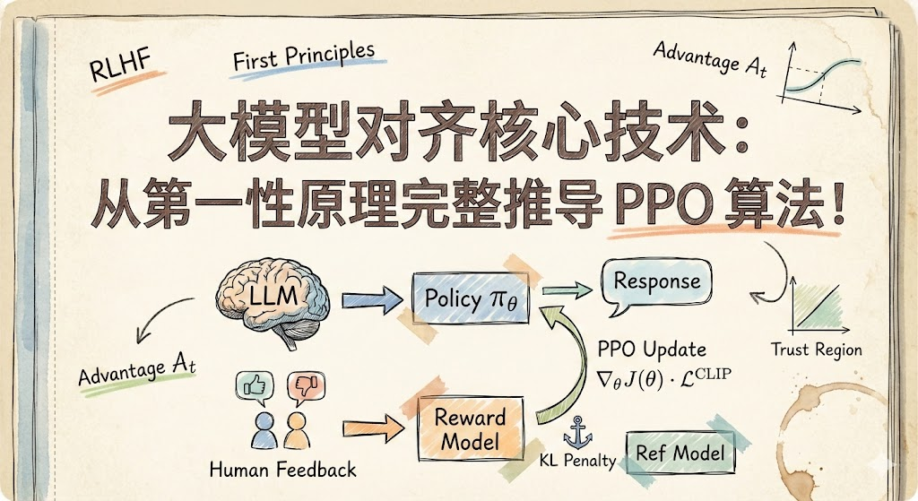 强化学习涉及大量数学推导。本文将通过详细的数学推导从第一性原理构建 PPO 目标函数,推导过程参考了 PPO 和 InstructGPT 原始论文以及 Umar Jamil 的视频教程。