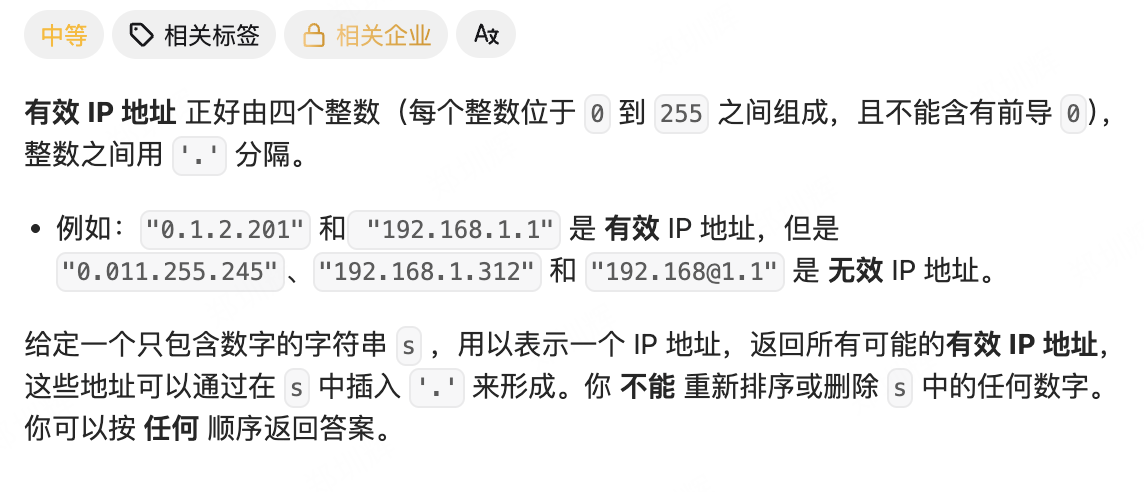 - 同时需要注意 剩下的位数, 应该足够后面剩下 的数字数量, 比如 计算 第一个数字的时候, 就需要保留至少3位数 ,少了 就不可能拼成IP。