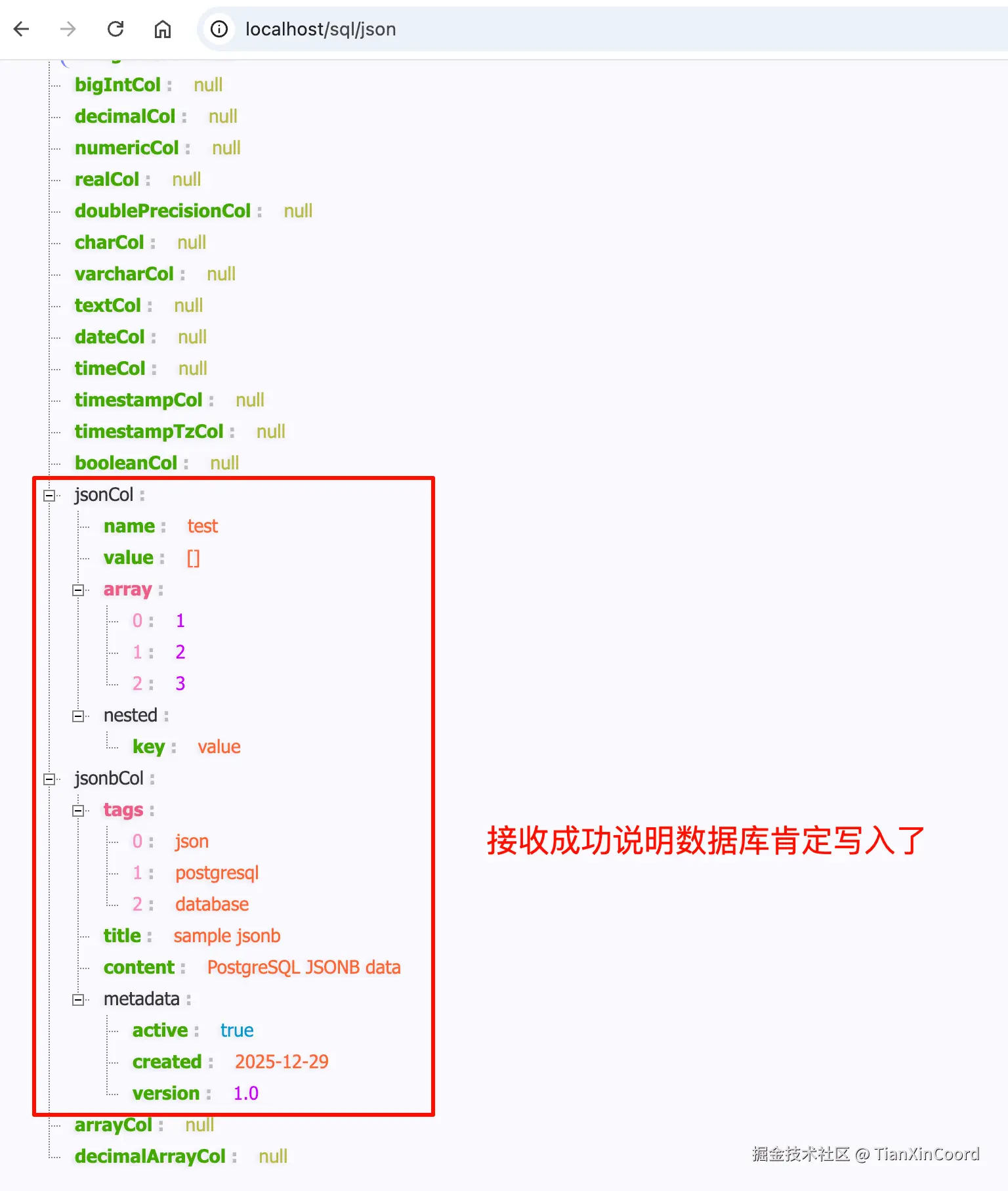 dataType.setJsonbCol(JSON.parseObject("{"title":"sample jsonb","content":"PostgreSQL JSONB data","tags":["json","postgresql","database"],"metadata":{"created":"2025-12-29","version":1.0,"active":true}}"));