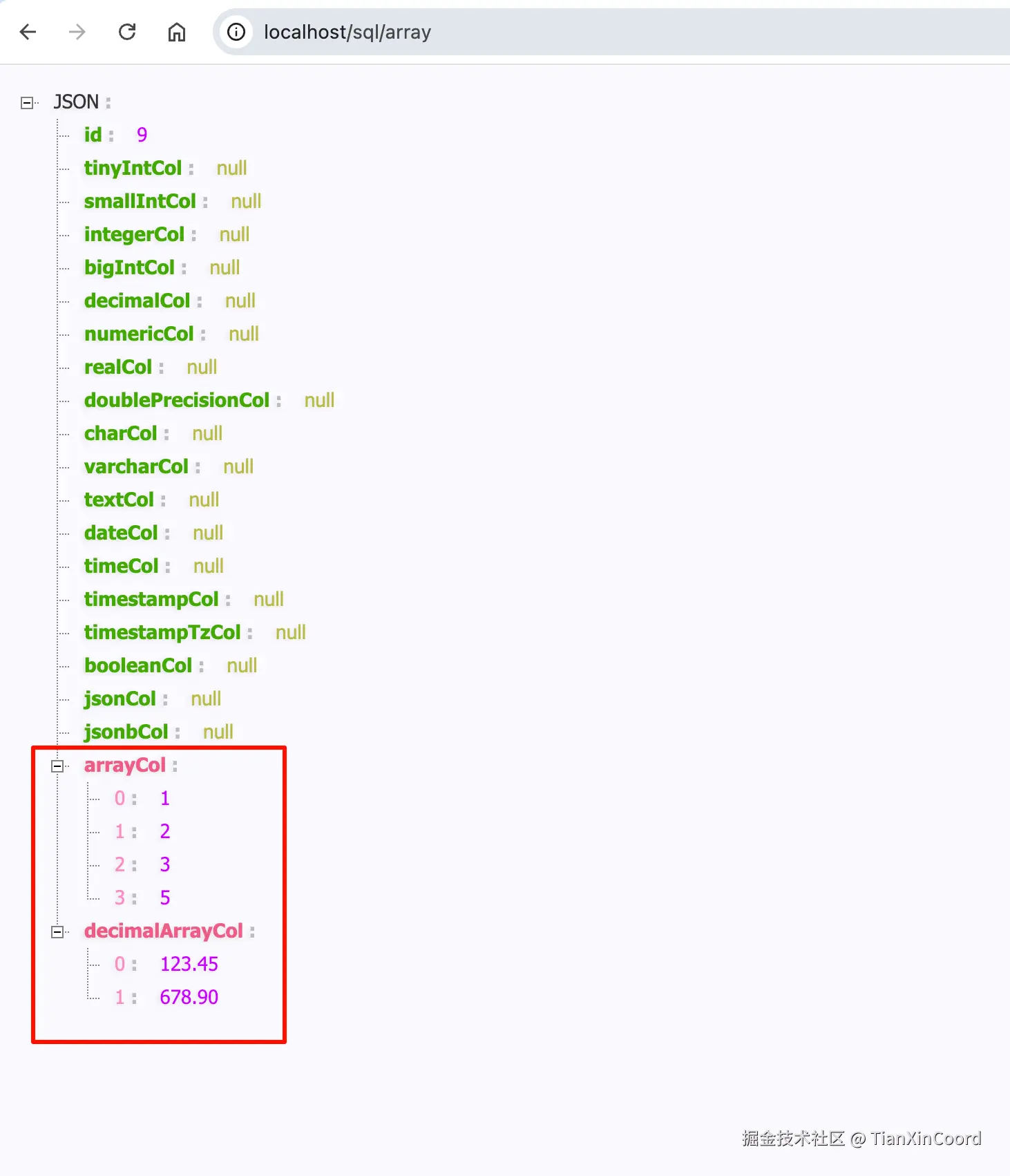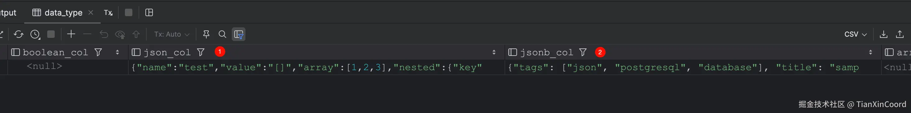 - 但是PGSQL中Json类型和数组类型并不能直接像MySQL那样,例如MySQL中JSON可以使用String类型存储和查询