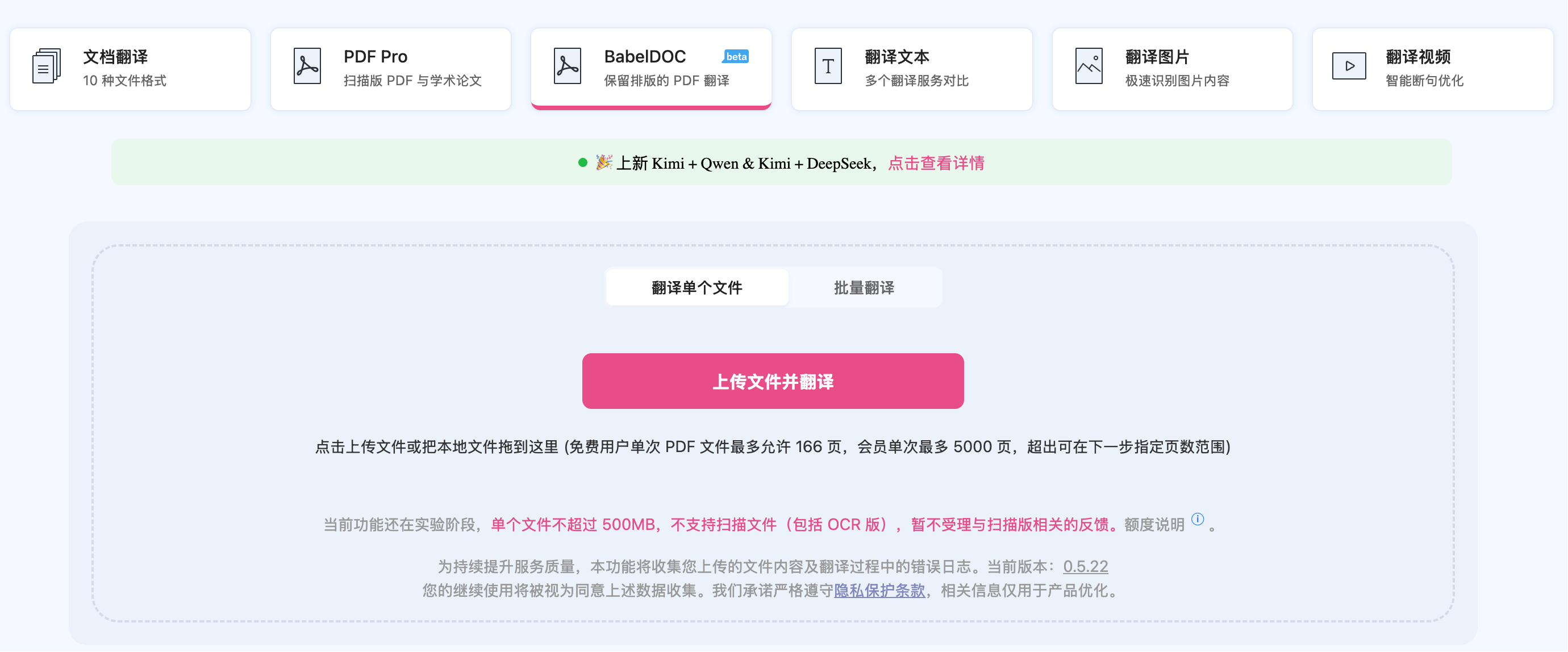 当前功能还在实验阶段,单个文件不超过 500MB,不支持扫描文件(包括 OCR 版),免费用户单次 PDF 文件最多允许 166 页。