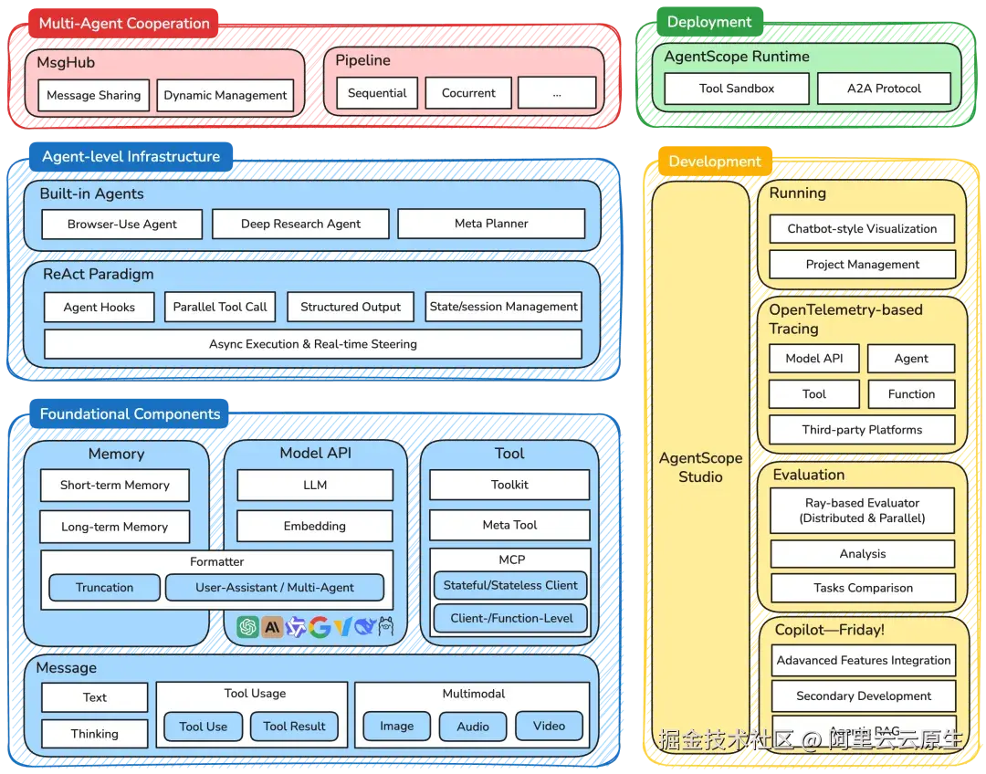 - AgentScope Runtime:帮助开发者实现 Agent 应用从 1 到 100,提供工具运行沙箱、A2A 协议、远程部署等强大能力。