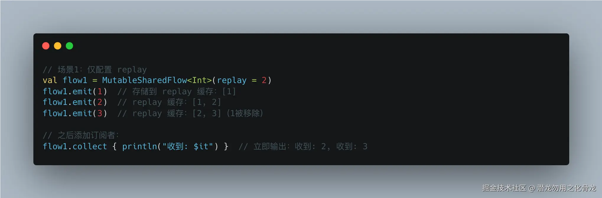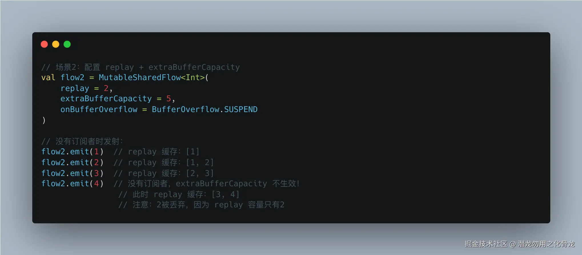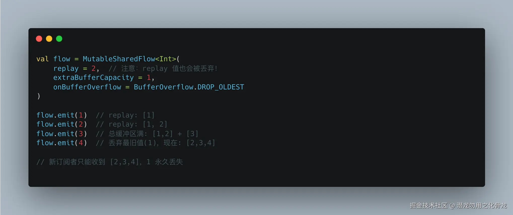 当 onBufferOverflow = DROP_OLDEST 时,被丢弃的可能是 replay 缓存中的值,这意味着新订阅者无法获得完整的历史记录。