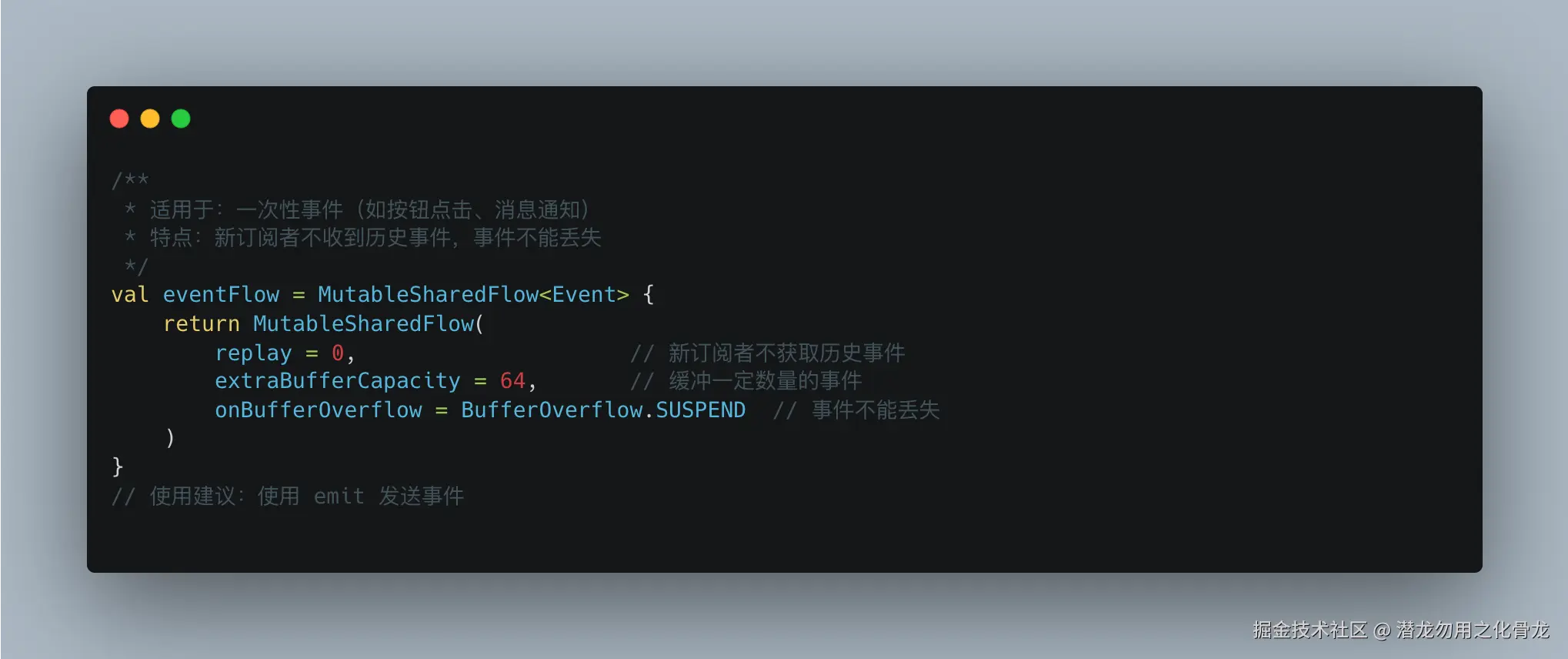 | 应用场景 | replay | extraBufferCapacity | onBufferOverflow | 发射方式 | 说明 |