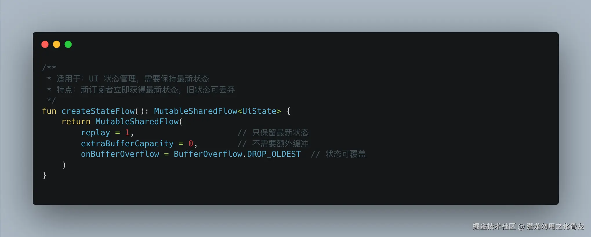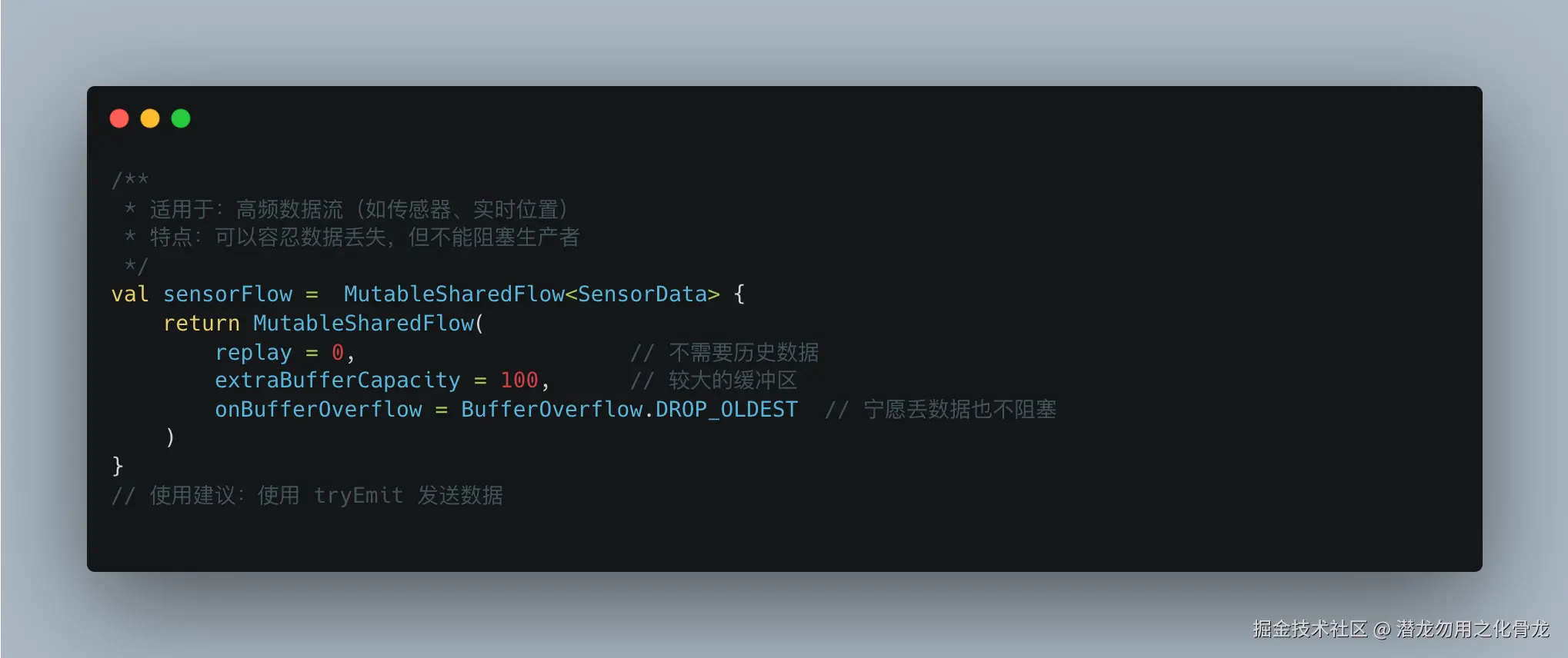 场景 replay 表现 extraBufferCapacity 表现 onBufferOverflow 触发条件 无订阅者 ✅ 持续工作 ❌ 不生效 仅当 replay 缓存满时 有订阅者 ✅ 新订阅者收到历史值 ✅ 处理背压(发射>收集) 总缓冲区满时
