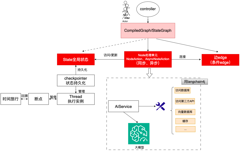 | 设计目的 | LangGraph4j则侧重于支持复杂、有状态的多智能体系统,通过有向图模型实现高级工作流控制 注: Multi-Agent框架 | LangChain4j专注于提供模块化的组件来构建基于大模型的简单应用 注:LangChain4j有顺序/并行等工作流来实现工作流控制 |