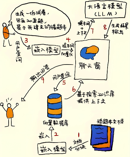 - 首先,「++数据预处理及形成存储索引++」在索引构建阶段,系统将企业或特定领域的非结构化私有知识(如文档、数据库记录)进行预处理,包括分块、向量化(使用嵌入模型转换为向量表示),并存储到向量数据库中,形成可快速检索的索引;