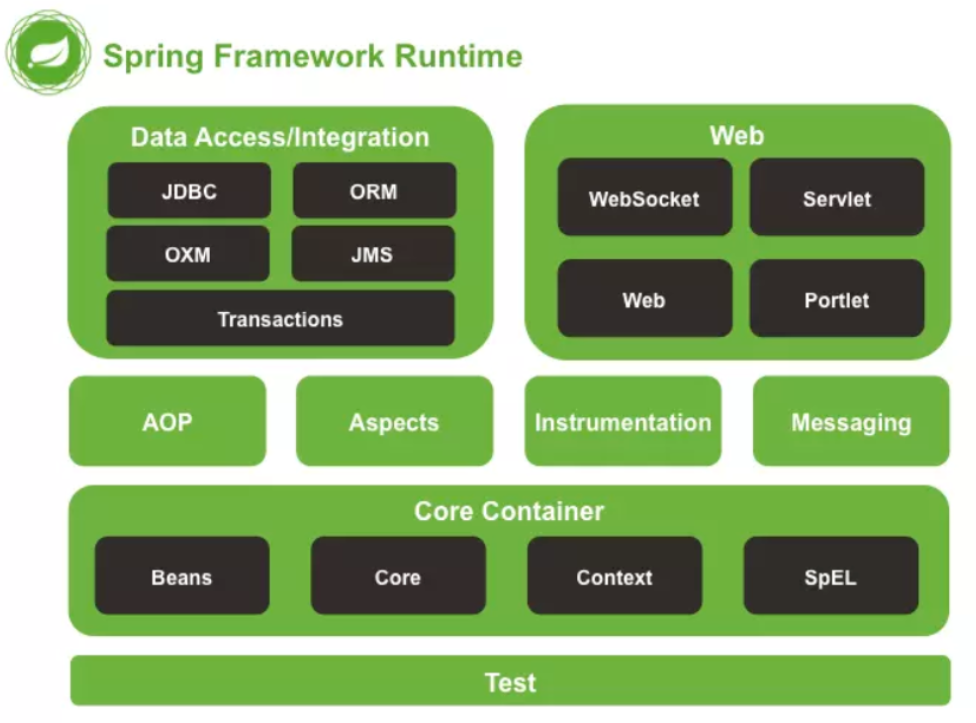 Spring大约有20 多个模块,这些模块分别被整合在核心容器( Core Container )、AOP、 设备支持(Instrmentation)、数据访问与集成(Data Access/Integeration) 、 Web、 消息(Messaging) 、 Test等 6 个模块中