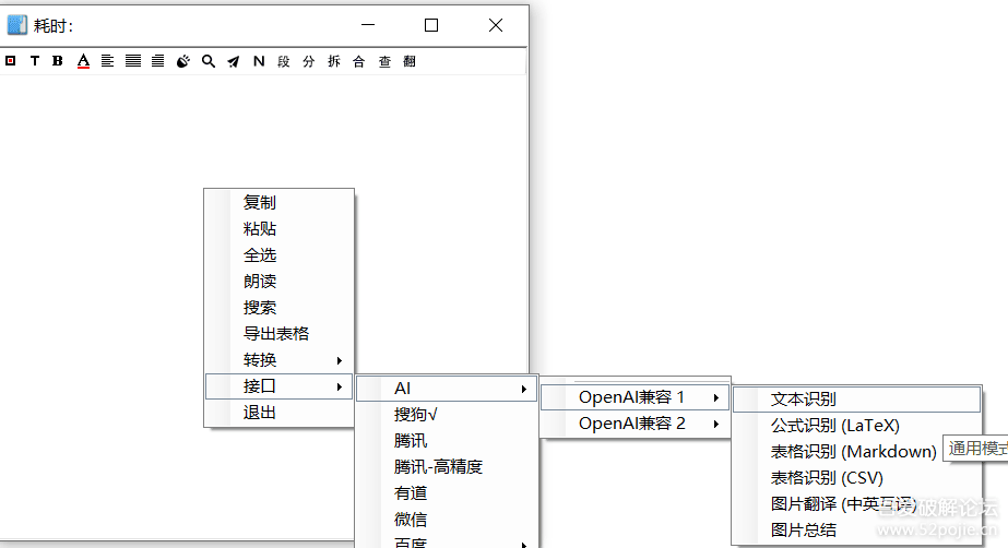 Windows\] 天若ocr开源版6.1-增加openai兼容接口 链接:[https://pan.xunlei.com/s/VOhZip2vdw8LbSmV6DMe48WiA1?pwd=wjip#](https://pan.xunlei.com/s/VOhZip2vdw8LbSmV6DMe48WiA1?pwd=wjip# "https://pan.xunlei.com/s/VOhZip2vdw8LbSmV6DMe48WiA1?pwd=wjip#")  * 增加 **`OpenAI兼容`** 接口,只要`api`支持`openai`兼容格式,都可以使用:`设置-AI密钥`,`设置-AI翻译接口` * 工具栏图标增加自定义大小功能:`设置-常规2-其他` * 增加添加文本改变后自动翻译功能的时间设置,设置为`0`时可以关闭此功能,使用高级语法可控制哪些接口关闭和开启此功能:`设置-常规2`,高级语法请看官方文档 * 增加`webdav`备份功能(实验性),只会备份`Data`文件夹,离线接口的模型、字典、高级配置文件和`ai`接口的模式文件如果不在`Data`文件夹,都不会被`webdav`备份,需要手动备份 * 设置窗口增加**鼠标滚轮切换设置页**功能,方便滚动切换设置页,需要把鼠标放到设置页的标题栏,然后滚动鼠标滚轮 * 设置窗口**允许调整宽度**,方便点击切换设置页,宽度会记忆至程序退出,如果软件重启,不会恢复上次的宽度 * 修复使用"右键菜单-转换-汉语拼音"时如果弹窗报错,之后点击翻译按钮会一直弹窗报错,除非重启软件的 bug * 修复二维码识别在识别纯文本二维码时结果为空的 bug * 修复有时翻译会翻译两次的 bug,出现场景比如文本变动自动翻译还没到时间前,用户手动点击一次翻译,之后自动翻译的时间到了,又会重新翻译一次 * 修复粘贴含有`emoji`的文本时,导致所有中文字符变方块的 bug * 优化:切换字体不再触发重新翻译 * **调整`paddleocr`,`paddleocr2`,`rapidocr`三个离线接口的识别效果**,修复多行文本识别结果有时缺失某个或几个换行的问题。调整后可能会出现段落文本识别结果多出换行的情况,后续看反馈多不多 * 优化程序目录,将大部分`dll`移动到`lib`文件夹(测试),看起来更整洁。如果遇到错误,请将`lib`文件夹里的`dll`移动回`exe`同级目录,并至仓库联系作者反馈 `openai`兼容接口使用智谱的免费的`glm-4.6v-flash`模型测试的,理论上支持`openai`兼容格式的`api`都能使用,如果遇到不能使用的请反馈。