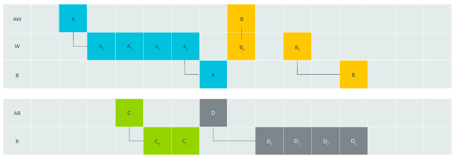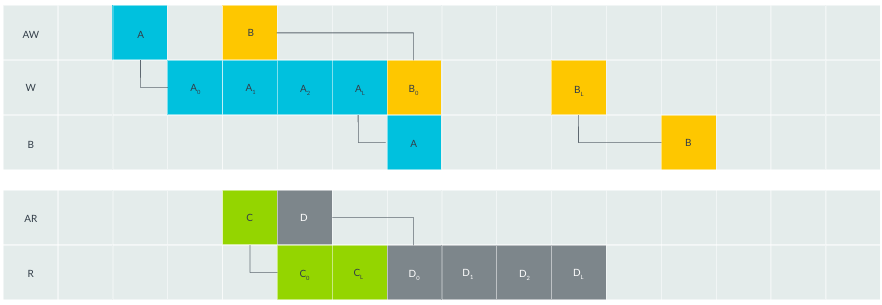 上面两幅图都是简单的AXI传输,其中一笔完整的传输叫transaction,比如A传输,而组成A传输的各个小的传输成为transfer,比如A*。