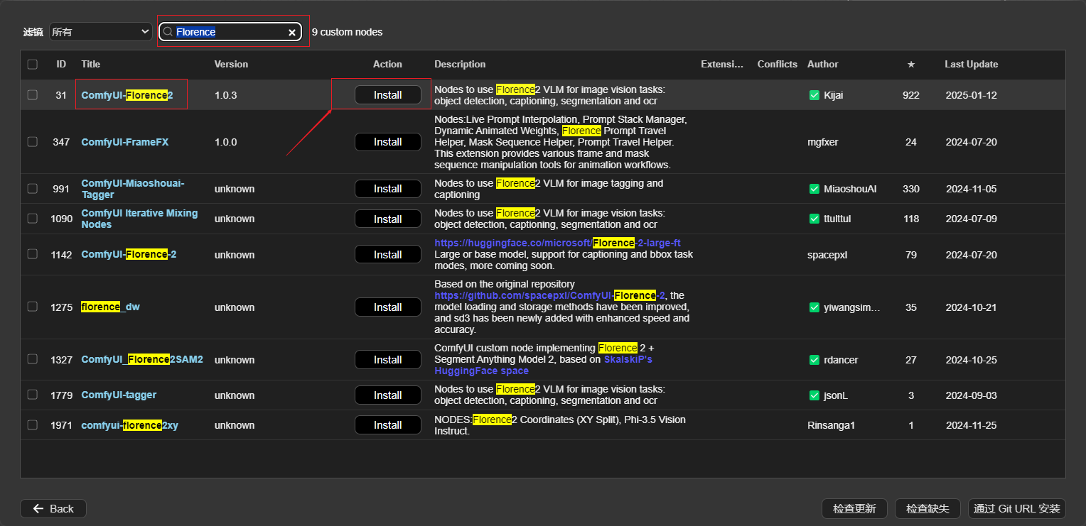 打开管理器,搜索Florence,按图示选择,点击"安装",重启comfyUI。