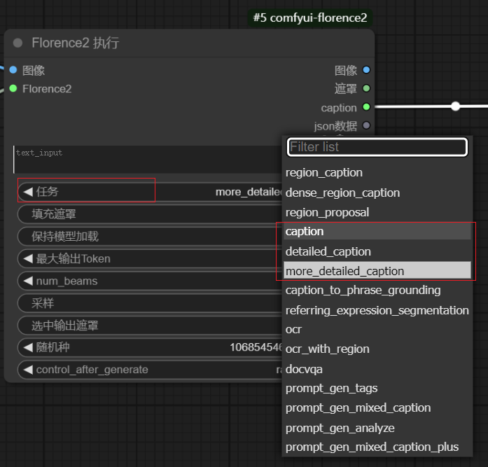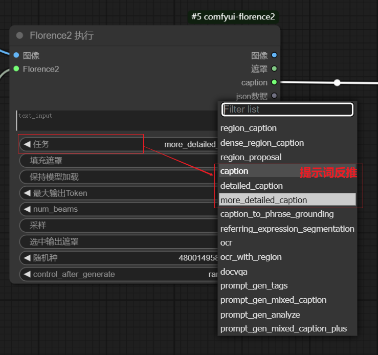 Florence执行节点中,"任务"栏共提供三种提示词反推功能:caption、detailed_caption、more_detailed_caption ,它们的精细度越来越高,使用时根据需要选择一种即可;同时,模型加载器中,选择不同的模型,精细度也会随之变化。