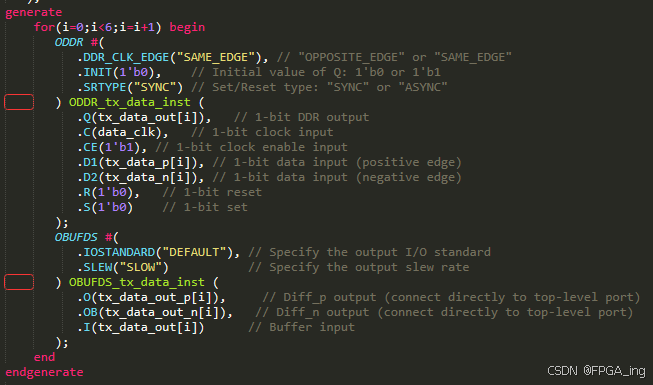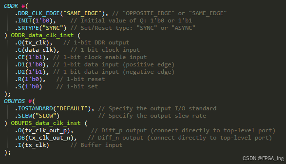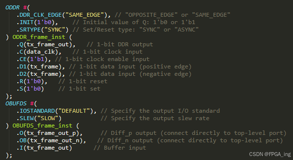 得到的数据和 tx_frame 以及 data_clk 都需要经过ODDR 单沿转双沿,再经过一个OBUFDS 输出出去;