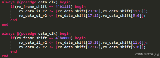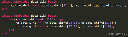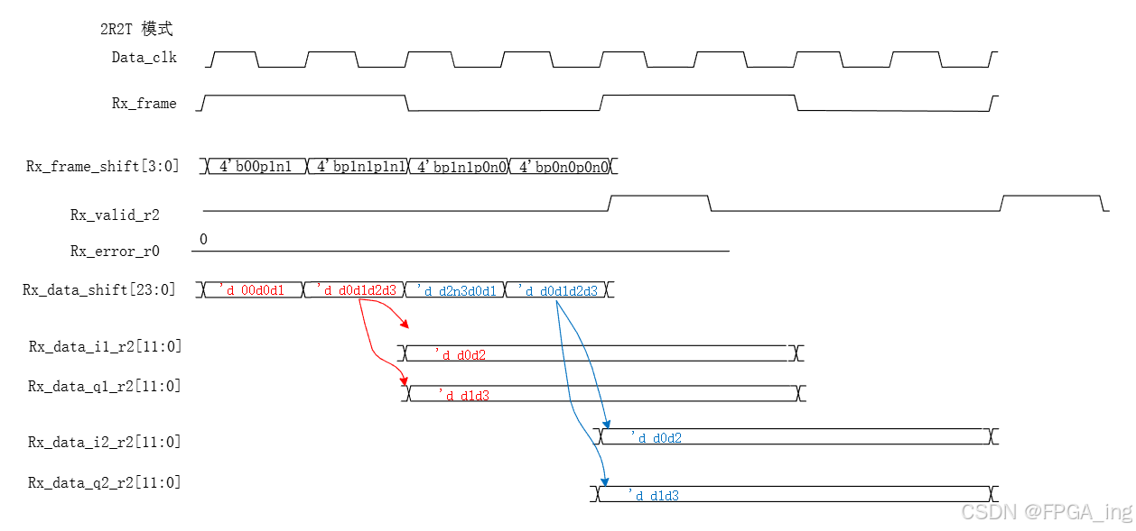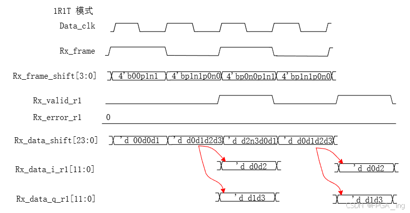 对于 rx_data 信号与Rx_frame 类似,参照下图时序,取对应的 Q 或者 I 进行拼接即可;