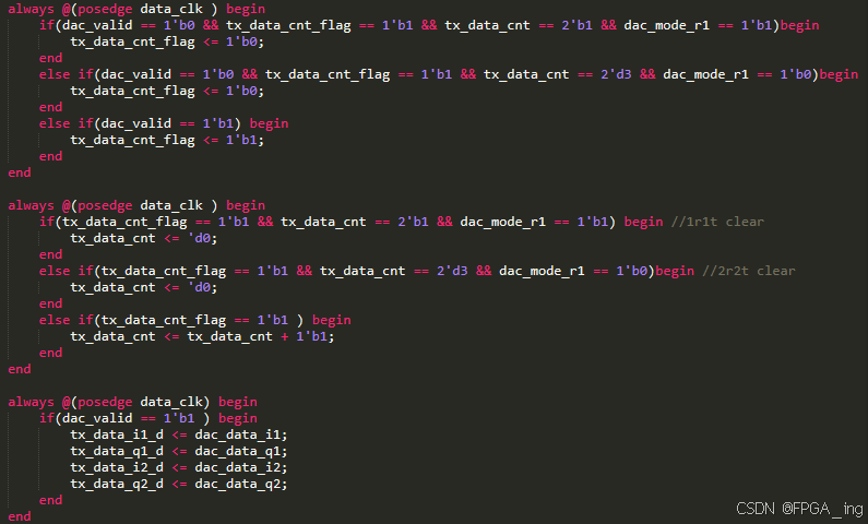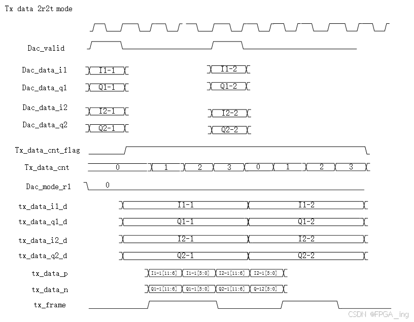对于2R2T,每隔 4个时钟周期(DATA_CLK)输出两个采样点(I1,Q1, I2,Q2);