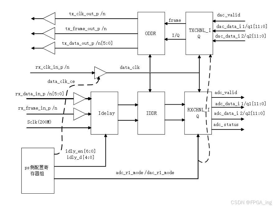 AD9361使用的是LVDS DDR通信模式,FPGA侧首先使用 IDDR 和 ODDR 的原语进行转换成单沿采样数据(RX),单沿输出数据转换成双沿数据(TX)。RX端使用 Idelay 原语进行动态调整接收数据与时钟延迟。TX端使用 ODDR 简单进行180度的相位翻转,因为在AD9361官方配置程序中 tx_fb_clock_delay 设置=7 也就是近似160度相位,这里两个180+160度相位累加就是变成了340度相移。