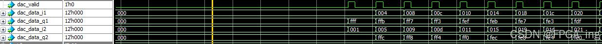 对于1T1R,每 2 个时钟周期SCLK 输入一个数据dac_data,包含12位的 I1 和12位的 Q1,